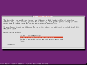 Select Guided – use entire disk and set up LVM.
