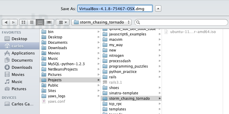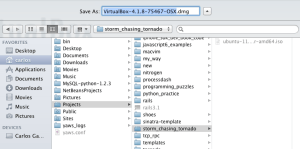 Will will be grabbing the latest version which at the time of writing is VirtualBox-4.1.8-75467-OSX.dmg. We will also be saving this dmg to the same folder in our home directory and then running the installer.