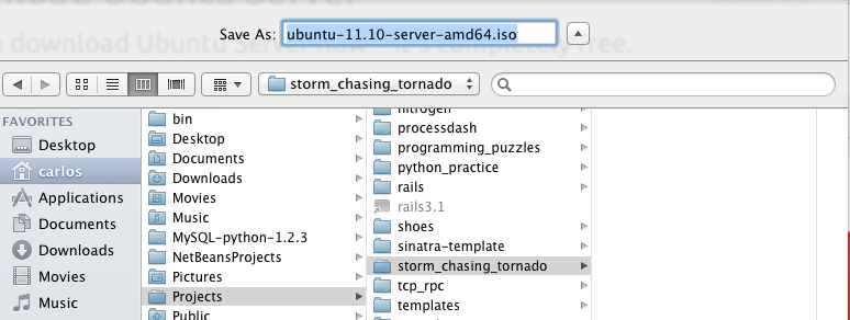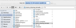 We will be downloading the latest server version which at the time of writing is ubuntu-11.10-server-amd64.iso. We are going to save this iso to a folder in our home directory which for this article is ~/Projects/storm_chasing_tornado