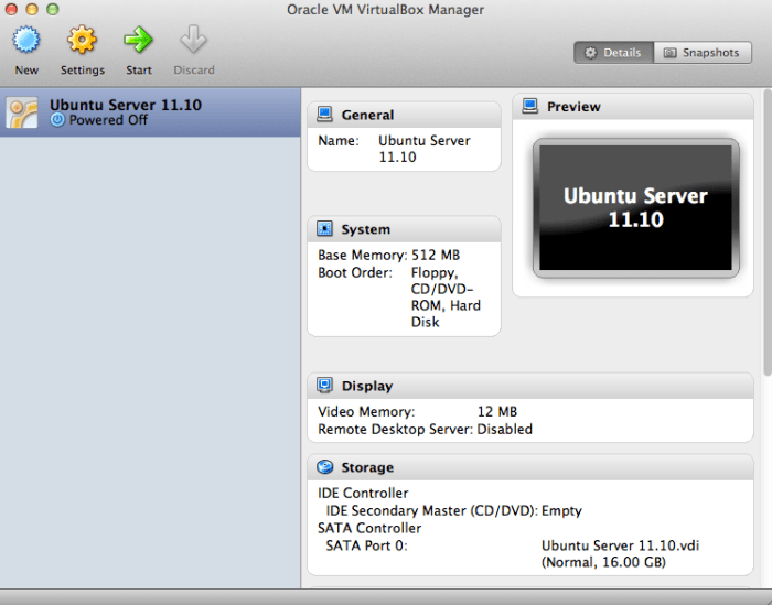 Excellent our Virtual Machine is installed and configured now let’s get Ubuntu installed. From the VirtualBox Manager we will click on the Start button.