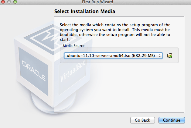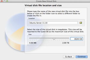 Now we will select the ubuntu-11.10-server-amd64.iso that we downloaded earlier to ~/Projects/storm_chasing_tornado then click Continue.