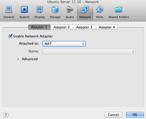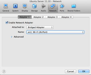 Now that our Virtual Machine is setup we need to configure one more thing before we install Ubuntu. To be able to access our Virtual Machine from our host OS we need configure the VM VirtualBox Network Adapter to use a Bridged adapter. From the main Virtual Box Manager click on the Network link then select the Network tab.