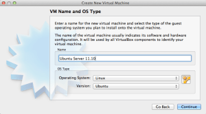 Next we will name our VM, let’s use Ubuntu Server 11.10. This will make it easy to identify if we decided to install other Ubuntu versions. Click Continue.