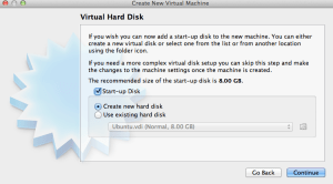 Now it is time to create the hard disk. When we click on Continue it wil launch the virtual disk creation wizard.